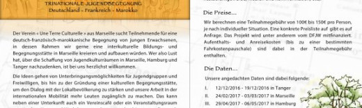 Der Verein « Une Terre Culturelle » aus Marseille sucht Teilnehmende zwischen 18 und 30 Jahren für eine deutsch-französisch-marokkanische Begegnung von jungen Erwachsenen, in dessen Rahmen wir gerne eine interkulturelle Bildungs- und Begegnungsstätte in Marseille kreieren und aufbauen würden. Wer also Lust hat, über die Schaffung von Jugendkulturräumen in Marseille, Hamburg und Tanger nachzudenken, kann sich gerne unseren Flyer durchlesen und sich bei uns melden.